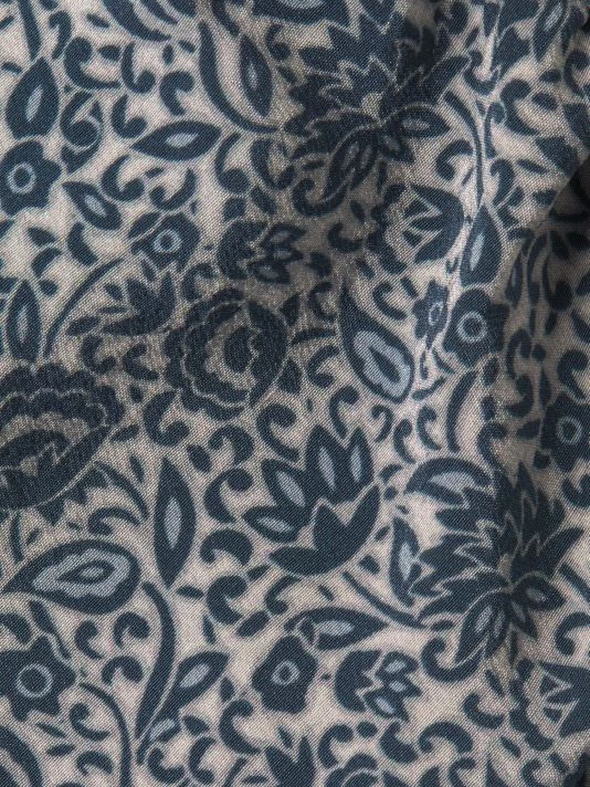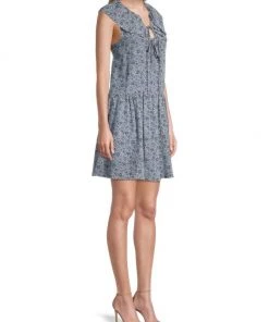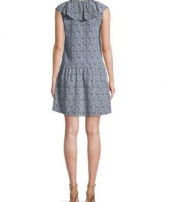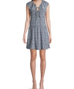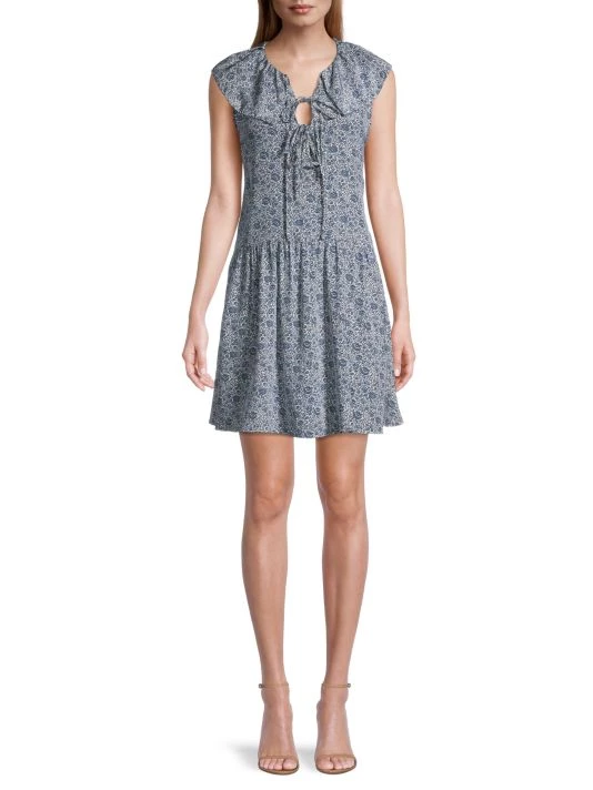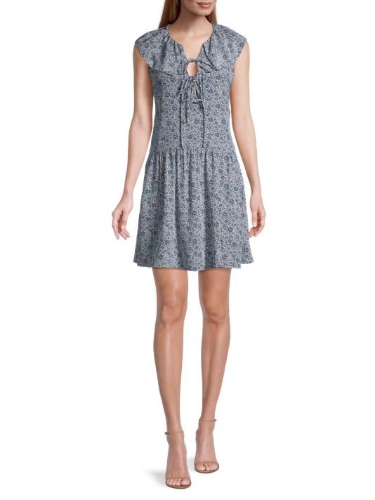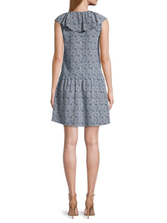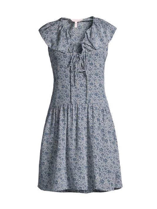 Wearable printed dress with cotton fabrication, lace-up neckline, and ruffle trim.